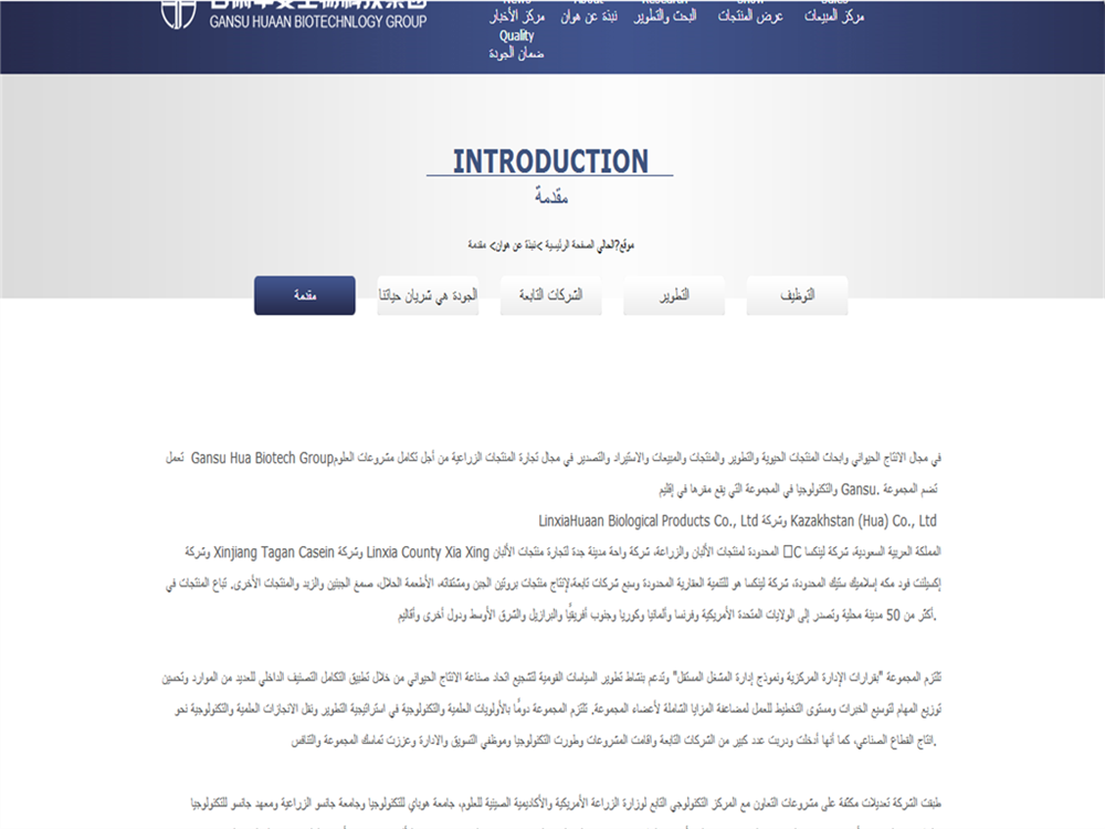2015年4月中旬旬,甘肃某生物科技集团与我公司签订合同,委托我方为其提供公司网站的翻译并负责其阶段性的信息内容更新的翻译。该公司是一家集养殖基地建设、生物制品研发、生产、销售、农产品进出口贸易为一体的科技型企业集团,总部设在甘肃省临夏州,其产品远销海内外。该次网页翻译不仅包含公司简介、产品介绍、业务拓展及公司动态等相关信息,而且此次翻译不单单是语言文本的翻译,还涉及到色彩、图片等的处理以及对不同阅读习惯的考虑。高质量的翻译成果充分体现了我公司译员的专业能力及综合能力。